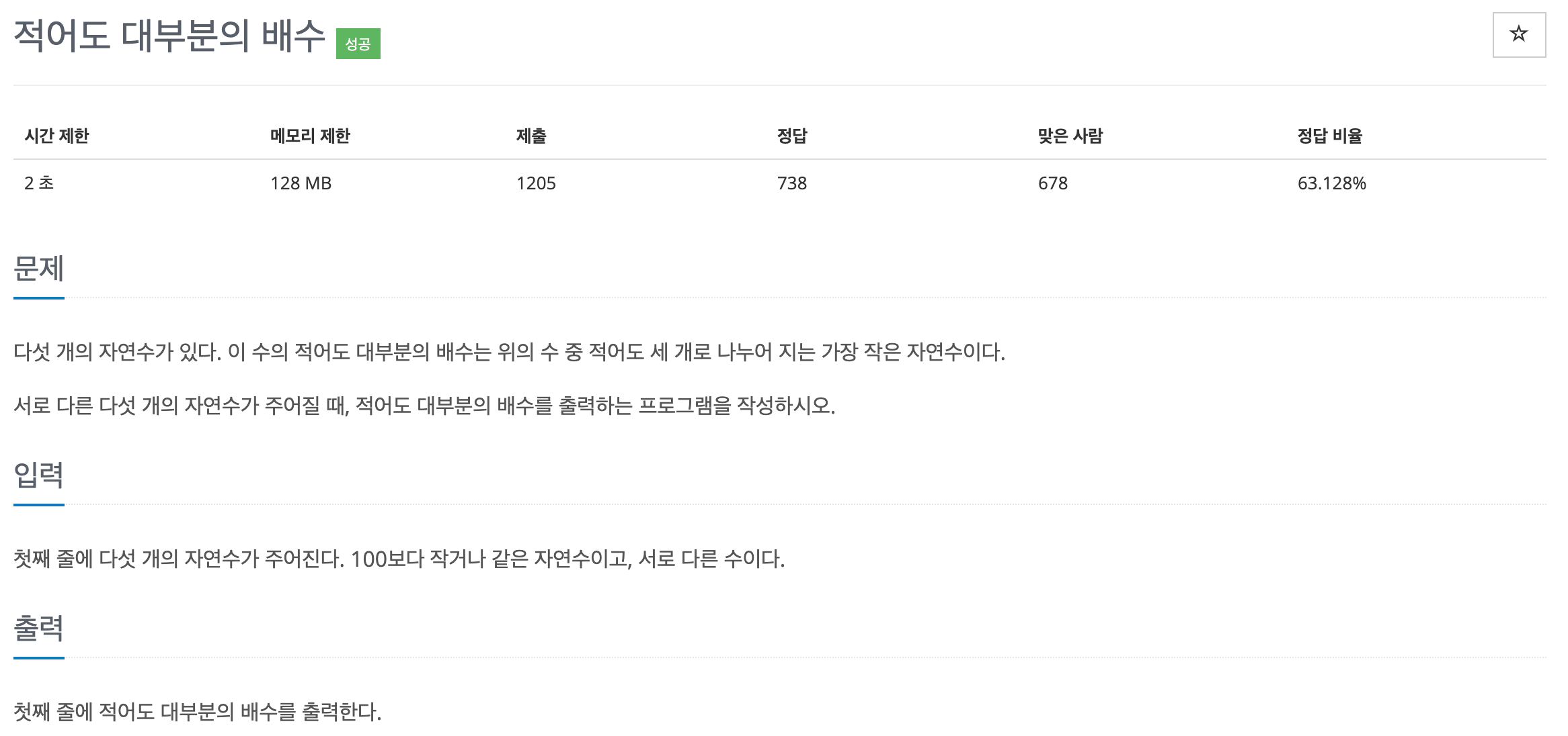 문제는 어떤 숫자 X(배수)를 구하는 건데 조건은 X입력받은 숫자들로 나누었을 때 나누어떨어지는 숫자가 3개 이상존재하는 X를 구하는 문제이다.