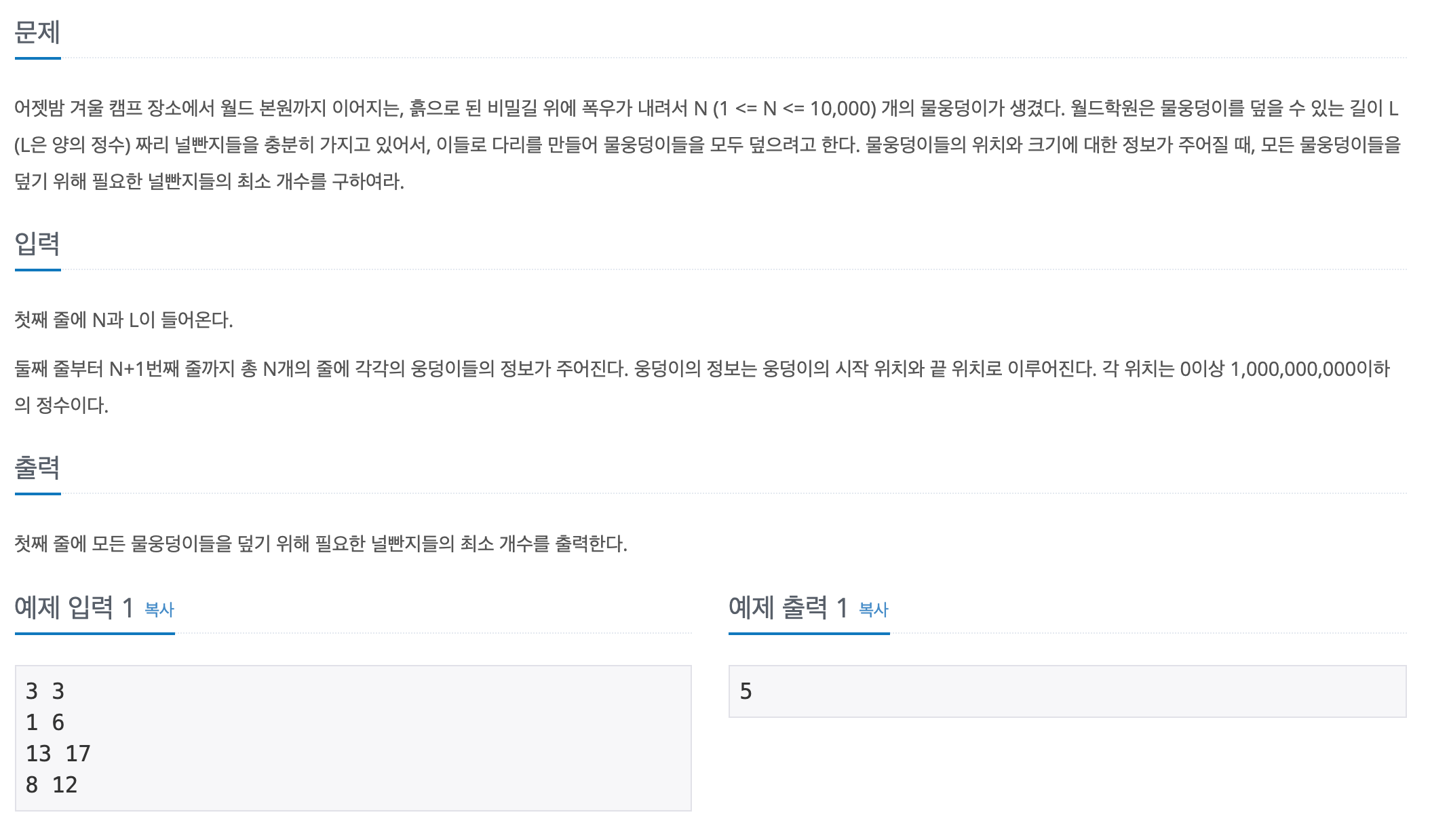 문제 자체는 이해하기 어렵지 않다. N개의 물 웅덩이와 길이가L인 널빤지가 있을 때, N개의 물 웅덩이를 덮을 수 있는 널빤지의 최소 개수를 구하는 문제이다. 한마디로 모든 물웅덩이를 덮는데 필요한 최소 널빤지 개수를 구하는 문제이다.