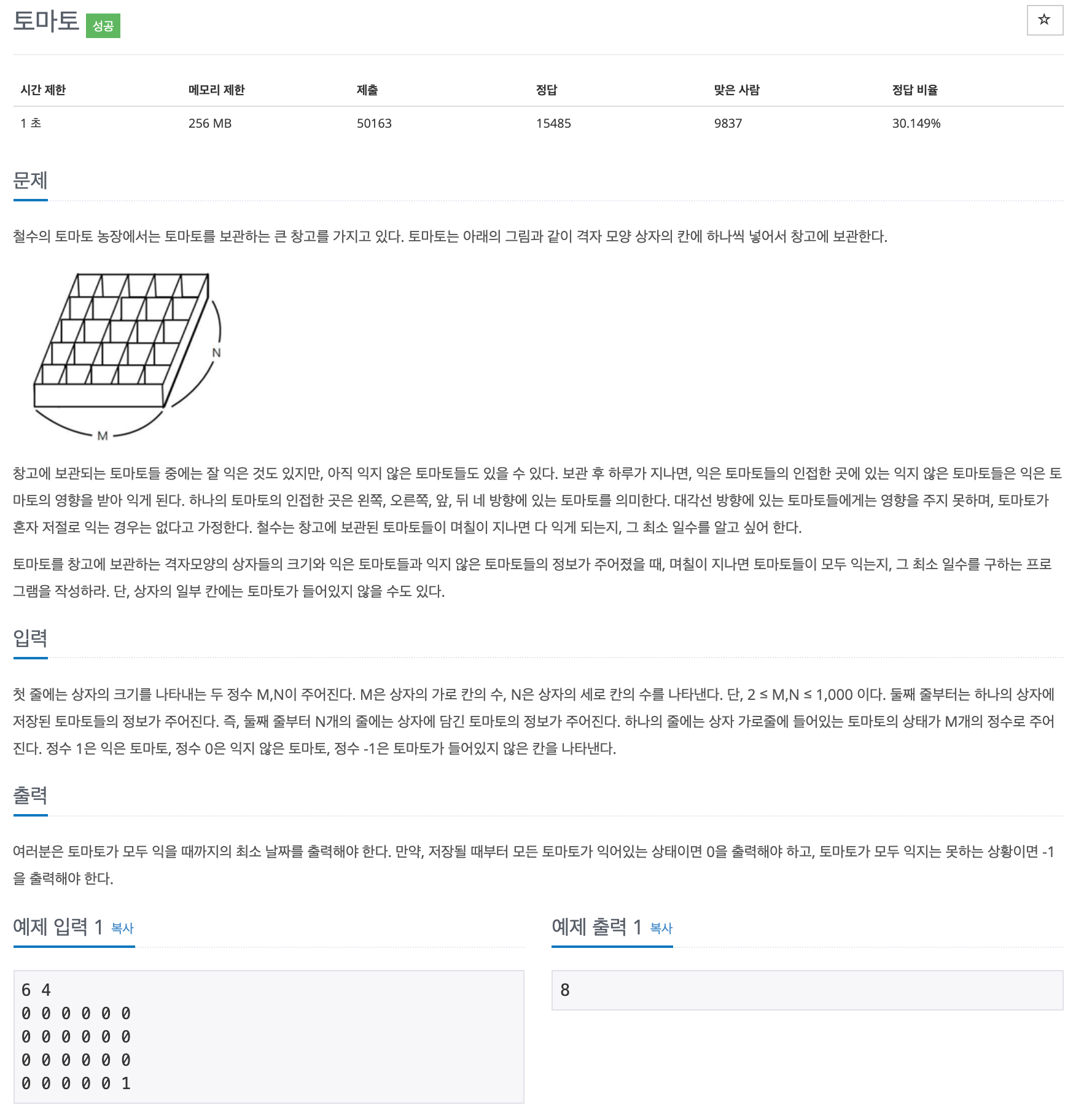 정사각형 박스에 익은 토마토와 익지 않은 토마토가 들어가 있다. 하루가 지날 때 마다, 익은 토마토의 상/하/좌/우 위치에 있는 익지 않은 토마토가 익게 된다. 이런 규칙으로 박스안의 토마토는 하나씩 익어 갈 때, 며칠이 지나면 다 익게 되는지 그 최소 일 수를 구하는 문제이다.