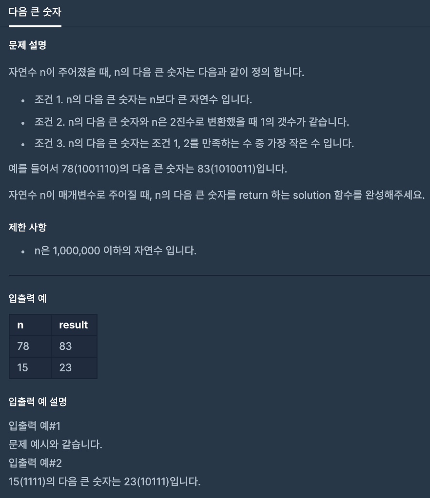 예를 들어 15의 경우 2진수로 표현하면 (1111), 1이 4개이고 15보다 큰 숫자중에 2진수로 표현했을 때 1의 개수가 4개인 숫자는 23(10111)이다. 이때 23을 return 하면 된다.