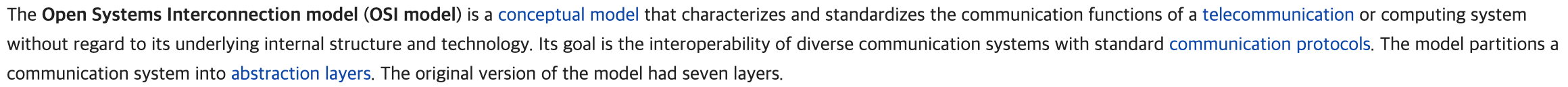 OSI (Open Systems Interconnection) 모델은 기본 내부 구조 및 기술에 관계없이 통신 또는 컴퓨팅 시스템의 통신 기능을 특성화하고 표준화하는 개념적 모델입니다. 목표는 표준 통신 프로토콜과 다양한 통신 시스템의 상호 운용성입니다. 이 모델은 통신 시스템을 추상화 계층으로 분할합니다