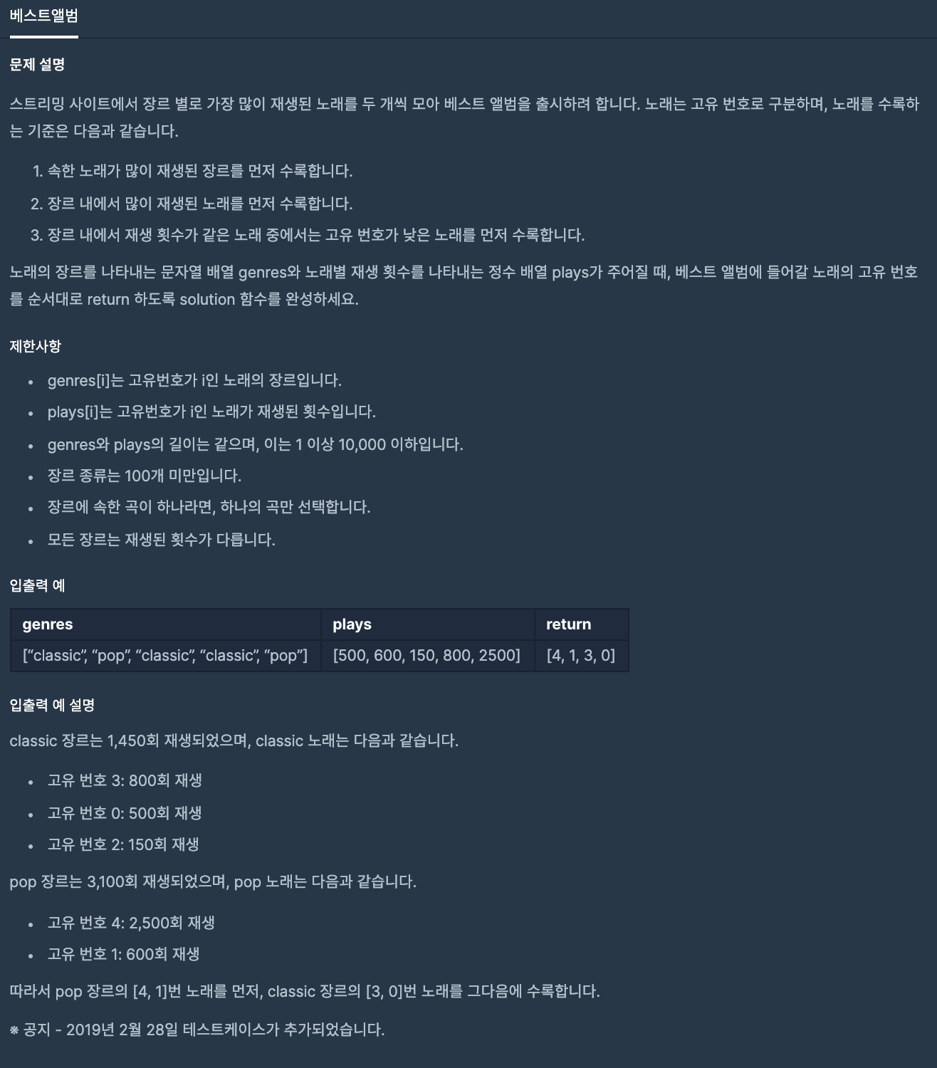 2개의 자료구조로 2중 포문을 사용하였고, 장르가 같으면 해당 장르별 음악들의 정보에서 값을 answer에 넣어주는 방법을 사용하였습니다.