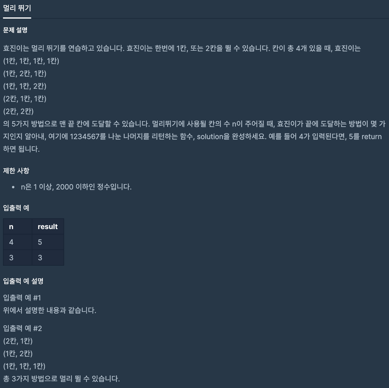 효진이는 1칸, 2칸을 이동할 수 있습니다. 이동해야 할 n칸이 주어질 때 1칸, 2칸을 n칸에 도달할 수 있는 방법을 구하면 됩니다.