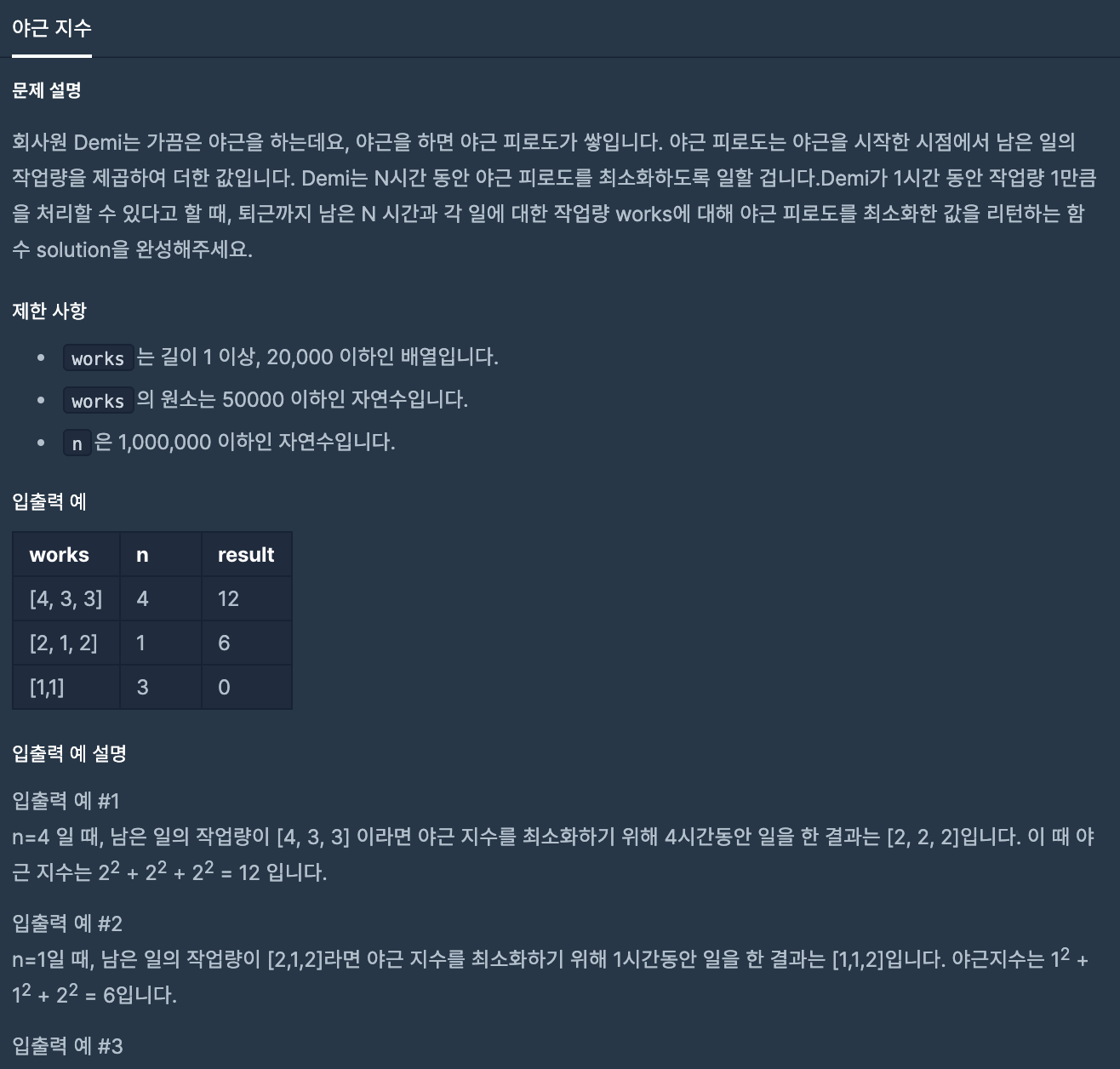 더 많은 경우가 있겠지만 위의 경우에서 야근 피로도가 최소값이 되는 경우는 [2,2,2]입니다. 이때의 야근피로도 12를 return 하면 됩니다.