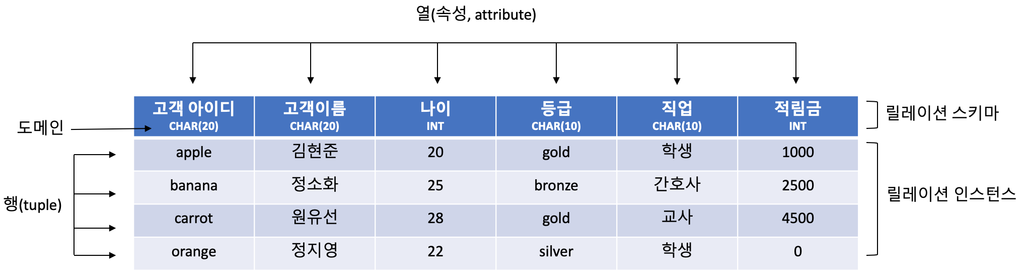 그림에서 릴레이션 스키마는 고객(고객아이디, 고객이름, 나이, 등급, 직업, 적립금)입니다. 릴레이션 스키마를 보면 릴레이션의 이름이 무엇이고, 어떤 속성들로 구성되어 있는지 전제 구조를 쉽게 파알할 수 있습니다.
