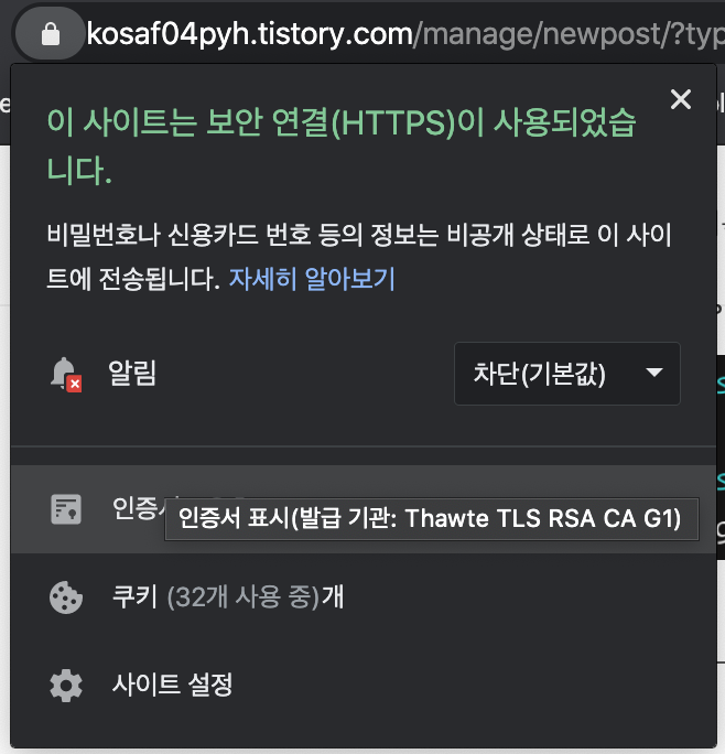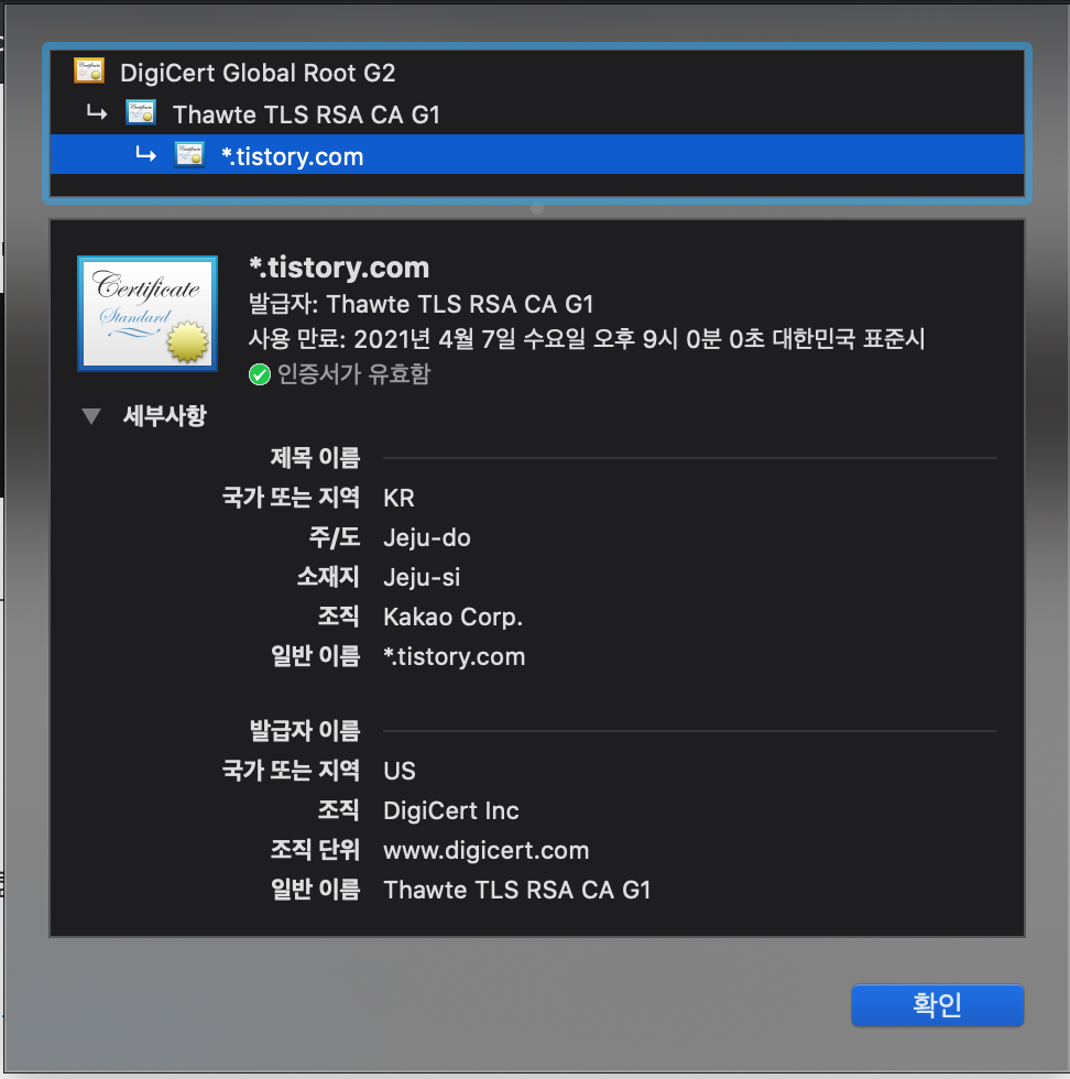 현재 제가 글을 작성하고 있는 티스토리 도메인의 CA는 DigiCert입니다. 이는 "DigiCert"라는 회사가 tistory는 믿을만한 회사(서버)야!" 라고 말해주고 있는것과 같습니다.