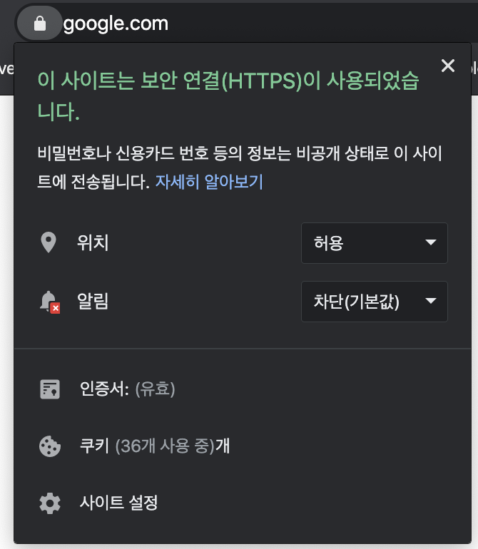 브라우저 주소옆 자물쇠를 클릭하면 클라이언트가 서버로 부터 받은 인증서가 누구로부터 공인, 인증을 받았는지 확인할 수 있습니다.