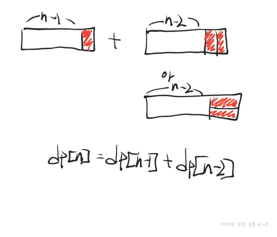 먼저, 결론부터 말하면...직사각형의 가로의 길이가 n인 경우는 (n-1) 경우의수 + (n-2) 경우의 수를 더한 값과 같다.