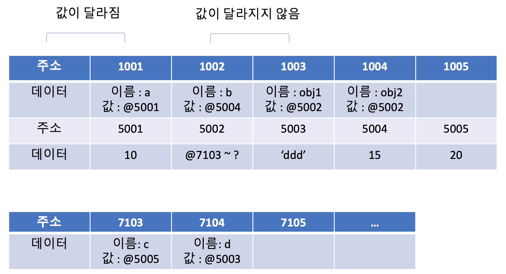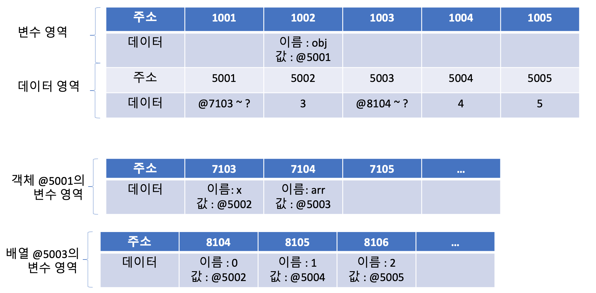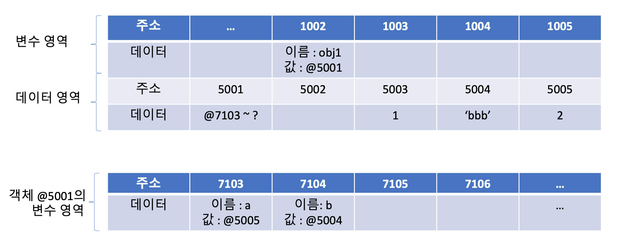 - 임의의 데이터 저장공간(@5001)에 데이터를 저장하려는데 이 데이터는 여러 개의 변수와 값들을 모아놓은 그룹(객체)입니다. 이 그룹의 각 변수(프로퍼티)들을 저장하기 위해 별도의 변수 영역을 마련하고(@7103 ~ ?) 그 영역을 @5001에 저장합니다.