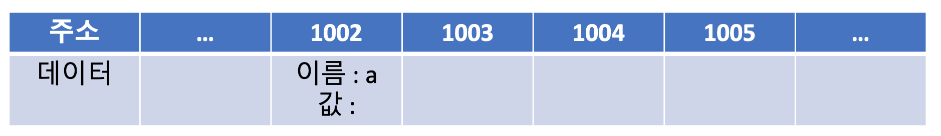 var a;에서 컴퓨터는 메모리에서 비어있는 공간 하나를 확보합니다. 예제에서는 임의로 1002를 지정하였습니다. 이 공간의 이름(식별자)를 'a'라고 하며 여기까지가 변수 선언 과정입니다. 이후에 사용자가 a에 접근하고자 하면 컴퓨터는 메모리에서 a라는 이름을 가진 수로를 검색해 해당 공간에 담긴 데이터를 반환할 것입니다.