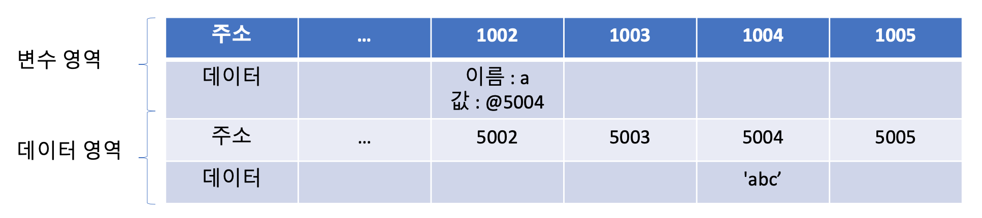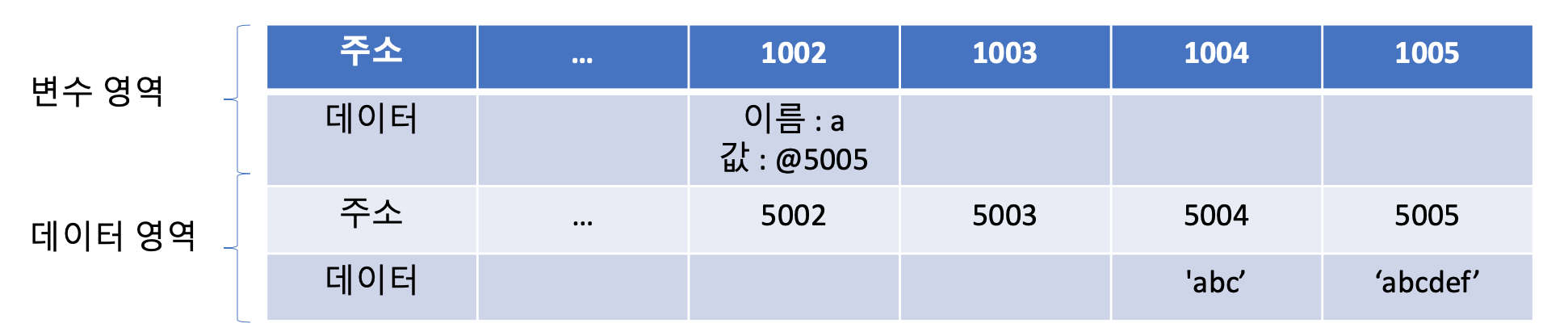 그런데 실제로는 해당 위치에 문자열 'abc'를 직접 저장하지 않습니다. 데이터를 저장하기 위한 별도의 메모리 공간을 다시 확보해서 문자열 'abc'를 저장하고, 그 주소를 변수 영역에서 저장하는 식으로 이뤄집니다. 이제부터는 데이터의 성질에 따라 '변수 영역', '데이터 영역'으로 구분해서 설명하겠습니다.