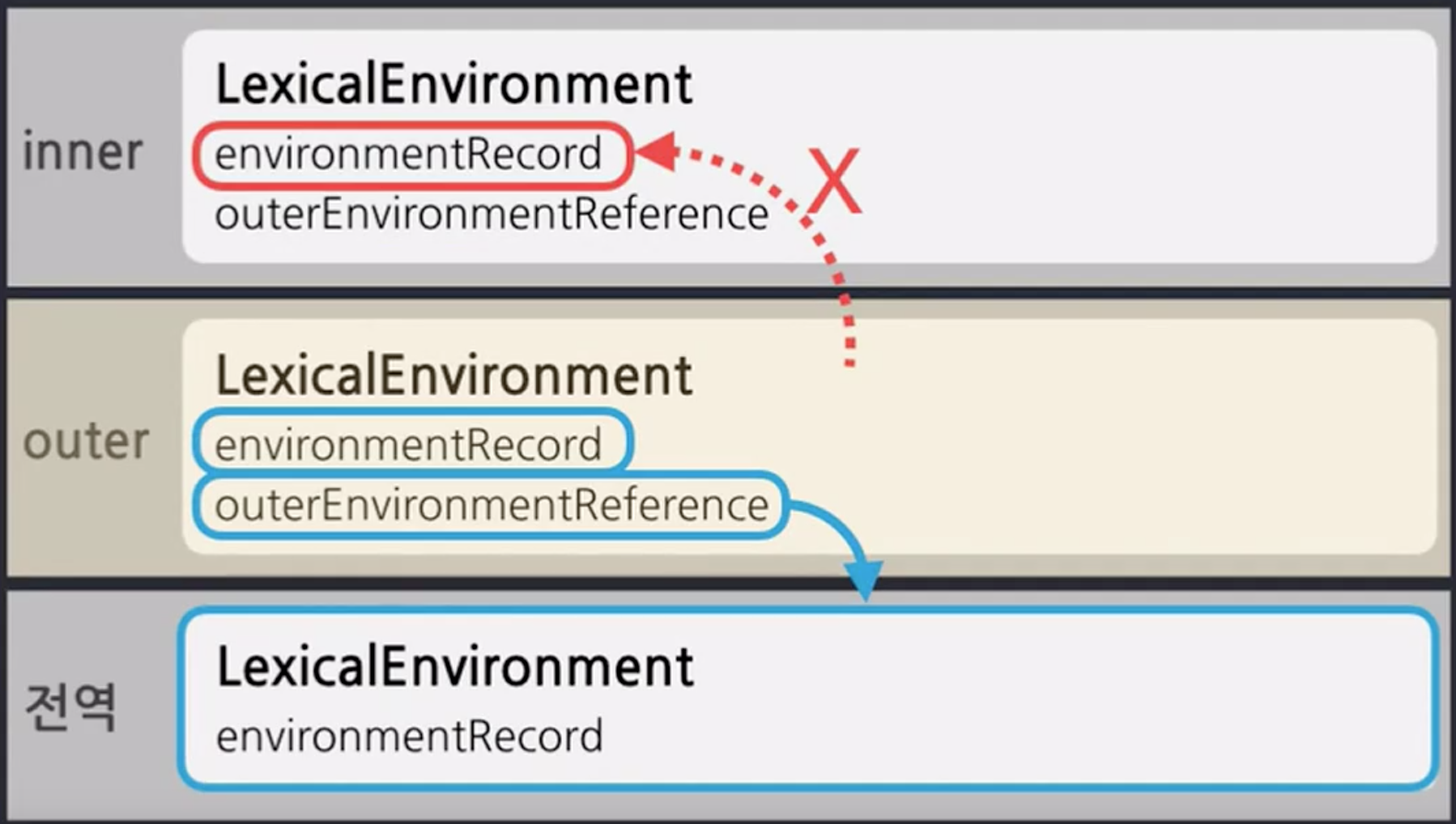 아래의 사진에서 outer의 environmentRecord + outerEnvironment는 전역 환경의 LexicalEnvironment입니다. 즉 전역환경의 식별자에 접근할 수 있습니다. 하지만 outer의 경우 자신보다 더 작은 스코프인 inner의 environmentRecord에 접근할 수 없습니다. 참조할 수 있는 방법이 없기 때문입니다.
