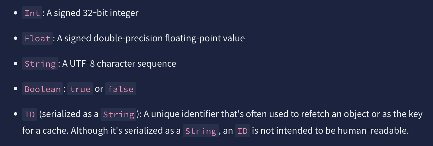 GraphQL에서도 Scalar type이 존재하며 공식 문서에서는 다음과 같이 설명하고 있습니다.