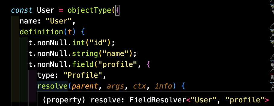 실제로 코드상에서 보면 FieldResolver<'User', 'profile'>이라고 되어 있으며, 이 타입은 결국 NexusGenFieldTypes['User']['profile'], 즉 NexusGenRootTypes['Profile']이 된다.