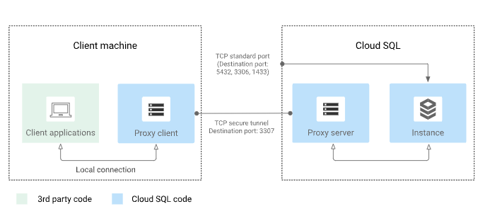 특히 TCP 연결의 경우 Cloud SQL 인증 프록시는 기본적으로 localhost(127.0.0.1)에 리슨합니다. remote db와의 통신은 인증 프록시를 매개로 연결되기 때문에 로컬에 설치된 인증 프록시로 연결되어야 합니다.
