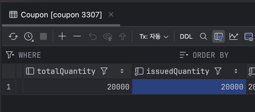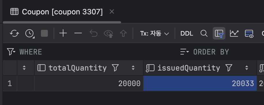 이전에는 쿠폰 발급이 더 많이 발급되는 코드였기 때문에 문제가 있었고, 현재 수정된 코드는 쿠폰이 정상적으로 20000개가 발급되었습니다.