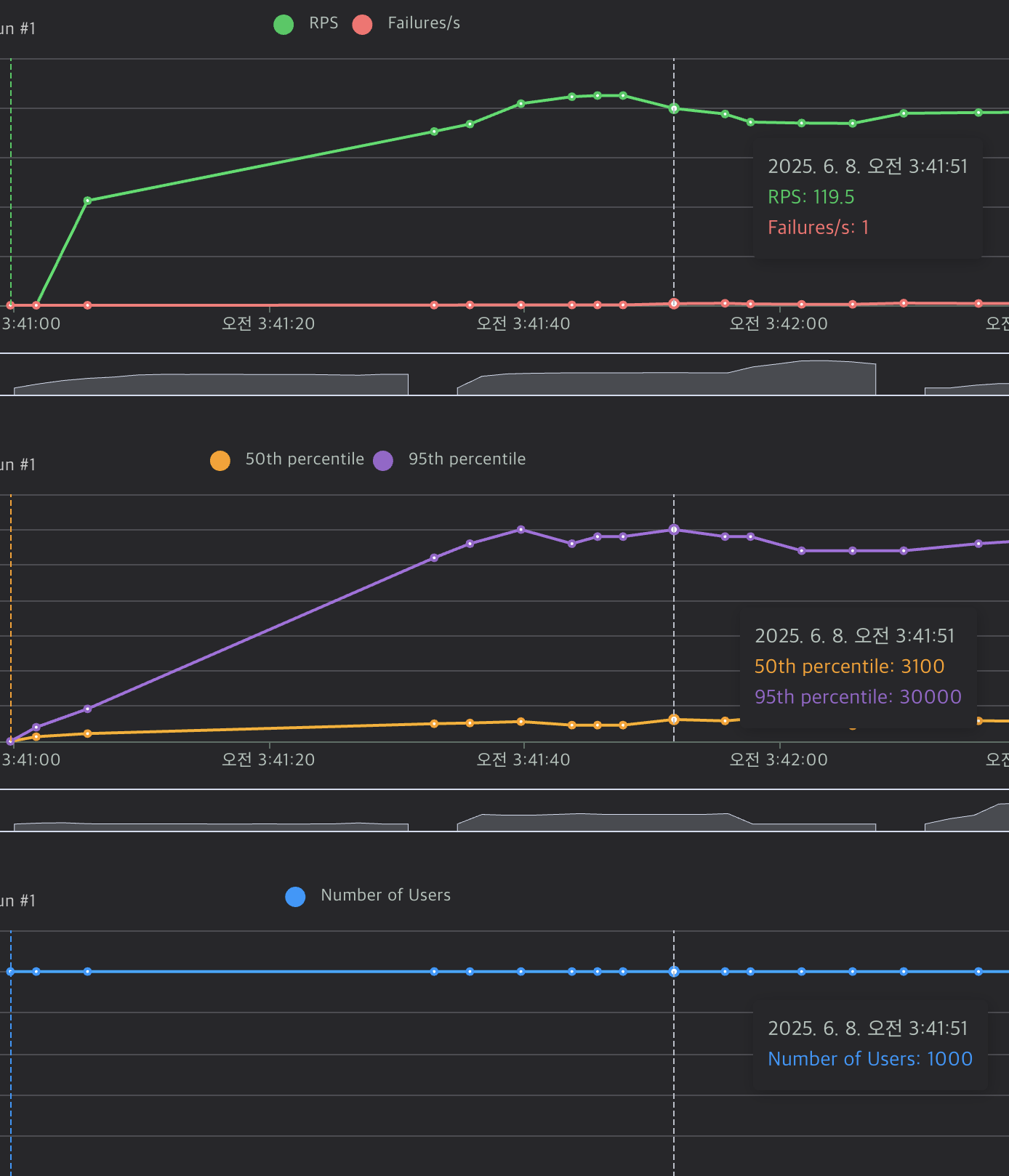 1000명이 동시에 요청을 보내는 조건으로 locust 부하테스트를 하며 RPS를 확인해 보겠습니다. 또한 docker와 grafana를 통해 서버의 cpu 사용량이 어느정도 되는지도 같이 확인해보겠습니다.