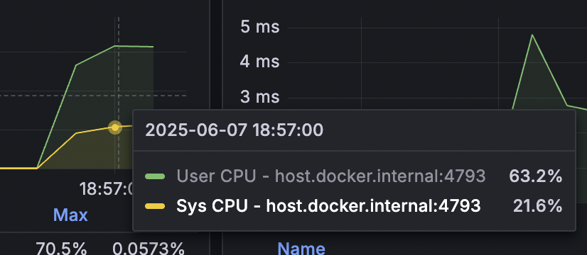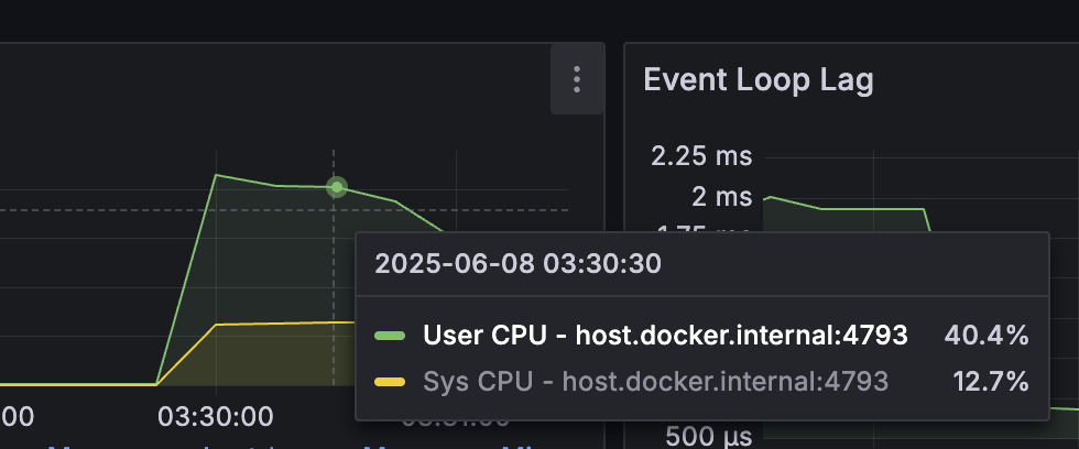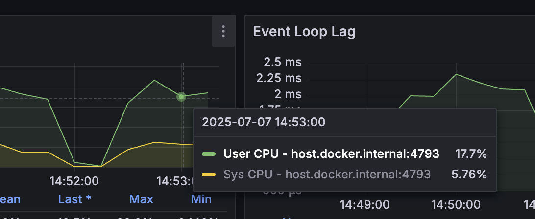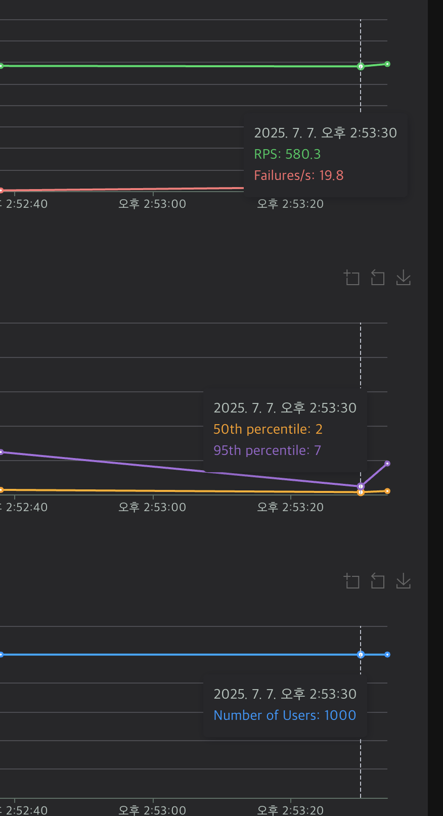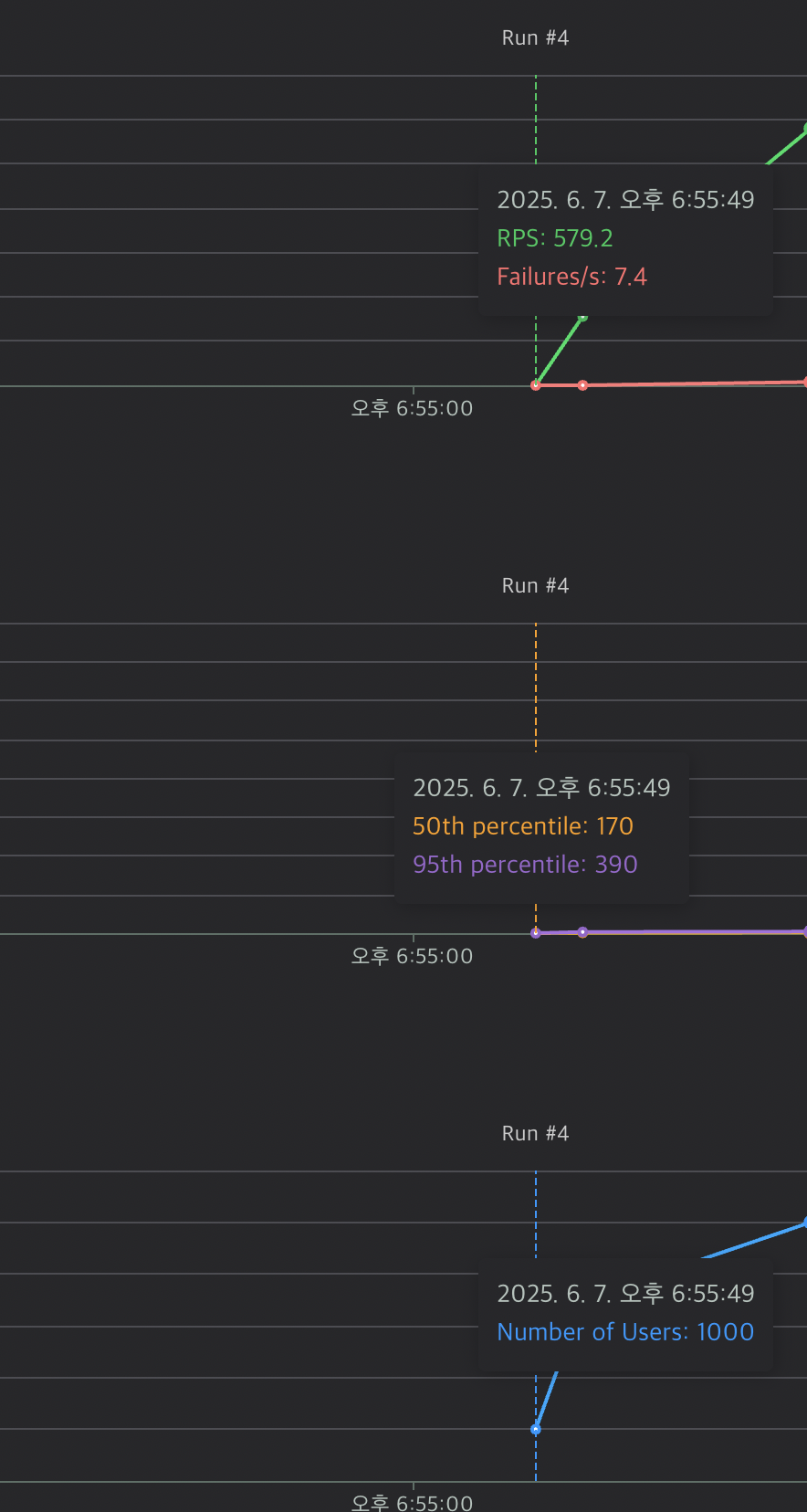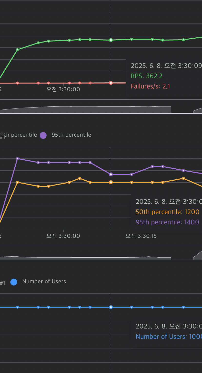 개선된 구조에서 가장 큰 차이점은 RPS와 P50의 차이 입니다. P50이 줄어들면서 자연스레 RPS가 늘어나 서버가 더 많은 요청을 처리할 수 있게 되었습니다.