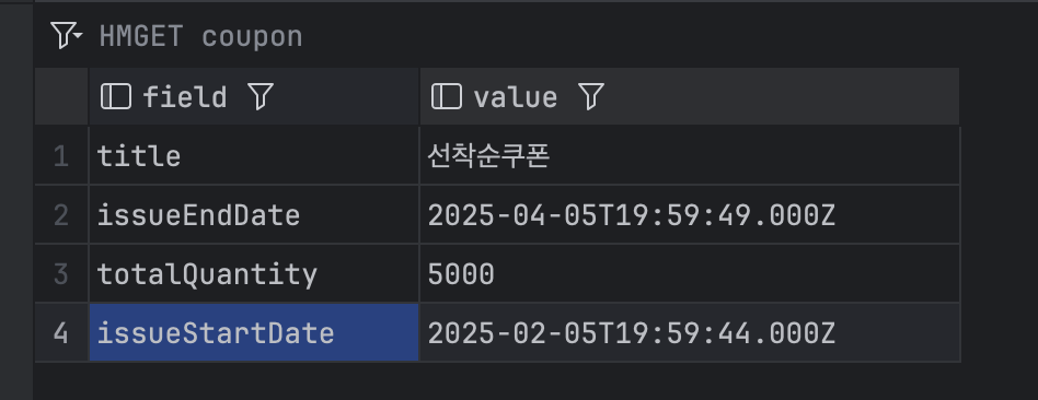 먼저 쿠폰 정보를 Hash에 저장합니다. 이 값은 "쿠폰의 유효기간 검증"와 "쿠폰 잔여 수량 검증"에서 사용됩니다.