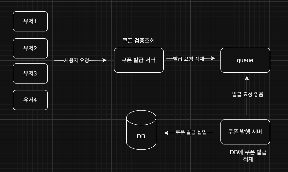 하지만, 좀 더 생각해보면 사용자는 쿠폰을 받고 바로 사용하지 않을 것이기 때문에 요청이 오면 "쿠폰을 발급 성공 여부"만 확인해주면 됩니다. 사용자에게는 쿠폰 발급 성공 여부만 응답으로 보내고, 서버에서 "쿠폰 발급할 유저 저장"한 다음에 이후 다른 서버에서 저장된 유저의 쿠폰을 발급하면 될 것입니다.