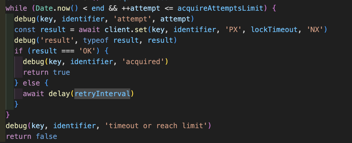 acquiure 메서드는 세마포어를 획득하는 메서드인데 SET NX를 성공하기 전까지 계속 busi waiting을 하게 되며, SET을 완료하여 true를 반환하여 임계영역에 진입하게 됩니다.